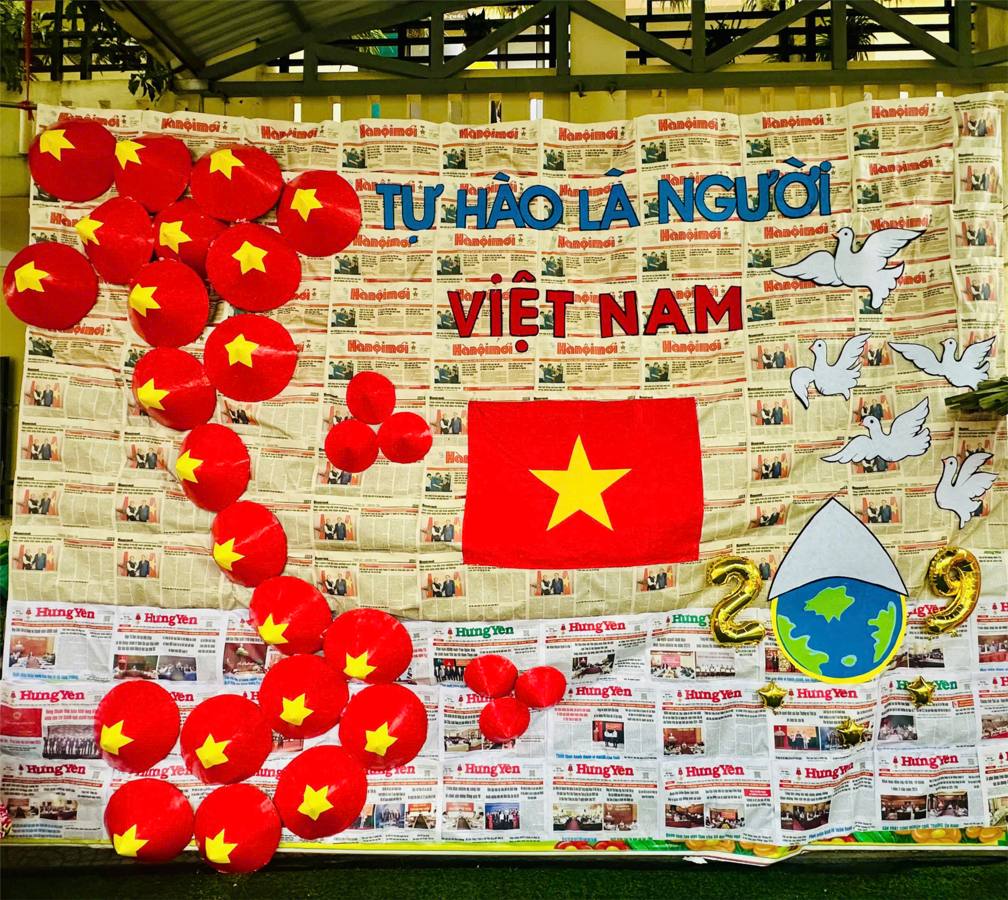 Cả trường tràn ngập sắc cờ, hoa mừng Quốc Khánh, hát vang bài hát "Như có Bác Hồ trong ngày vui đại thắng", "Đất nước trọn niềm vui".